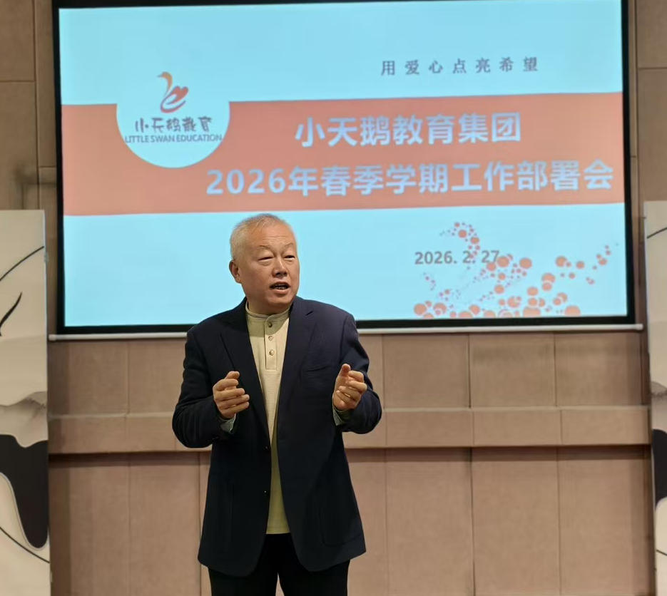 2026年2月27日,小天鹅教育集团在秦宝幼托中心多功能厅召开了集团2026年春季学期工作部署会,参加会议的有集团董事长、各部门领导、各园园长、中层管理人员及年级组长。
